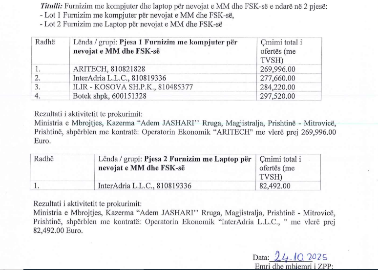 Ministria e Mbrojtjes ka dhënë tender dy kompanive të teknologjisë rreth 400 mijë euro për blerjen e dhjetëra kompjuterëve dhe laptopëve për nevojat e Forcës së Sigurisë së Kosovës dhe vetë Ministrisë së Mbrojtjes, shkruan Kujdestari.info.