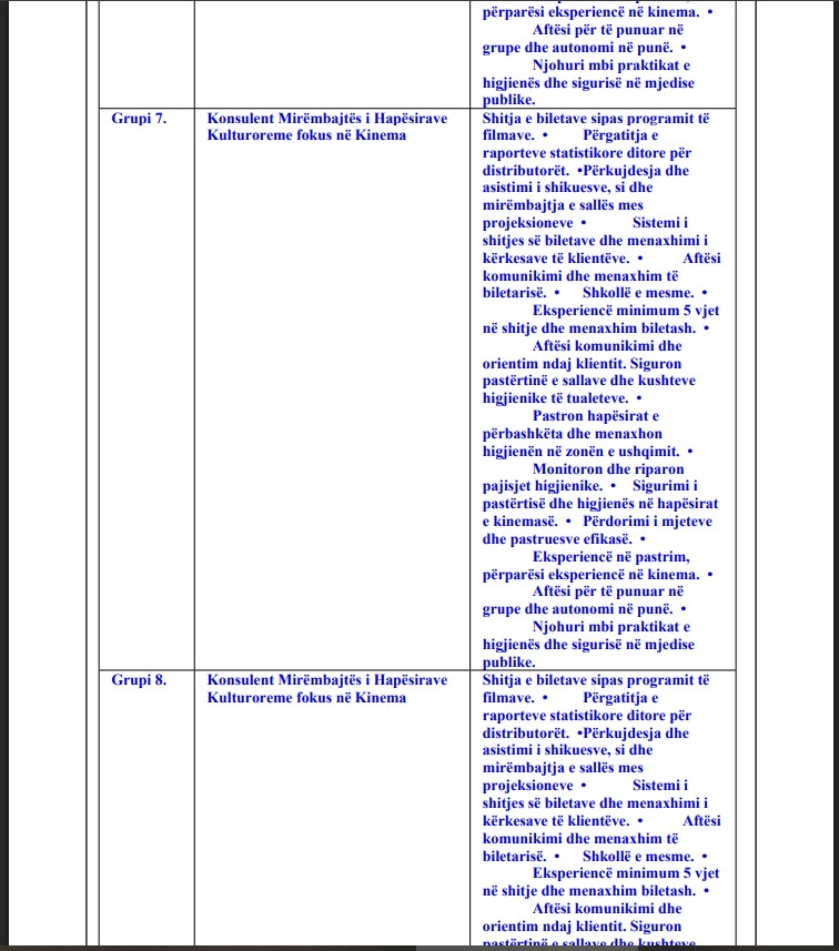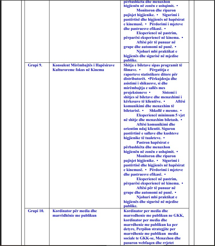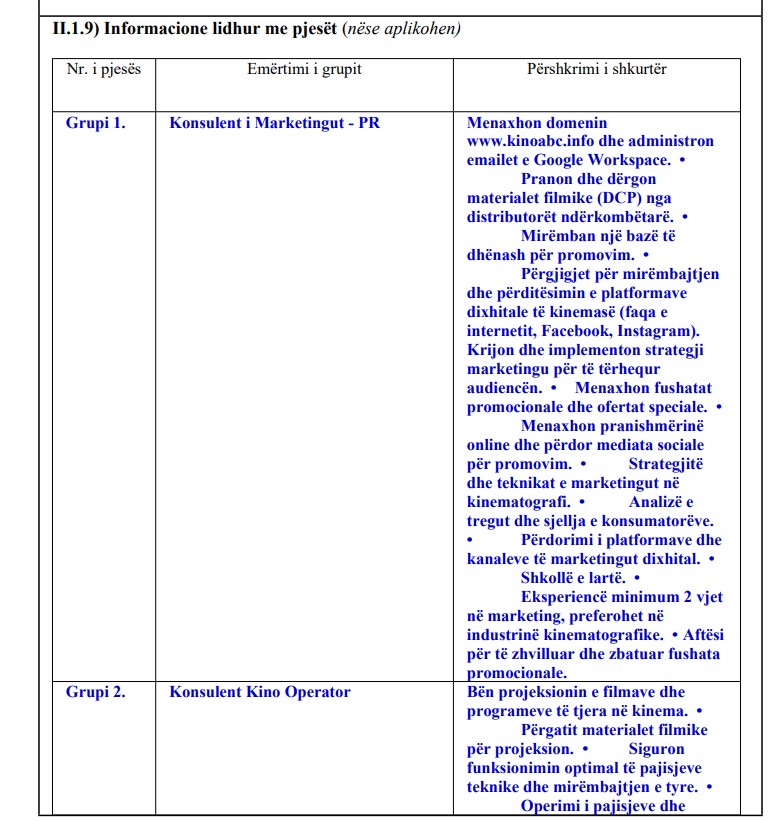 Në dosjen e tenderit, MKRS ka paraparë 10 grupe pozicionesh “konsulentësh” që variojnë nga Konsulent i Marketingut dhe PR, te Konsulent Kino Operator e deri te Konsulent Mirëmbajtës i Hapësirave Kulturore, me detyra që shkojnë nga menaxhimi i faqeve të internetit e mediave sociale, administrimi i emailave të Google Workspace, shitja e biletave, përkujdesja për publikun e deri te pastrimi i ambienteve të kinemave.
