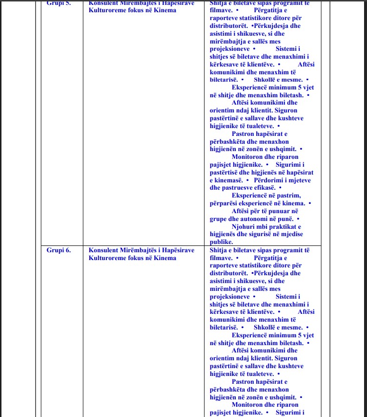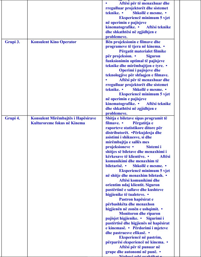 Grupet 2-9: Konsulentë Kino Operatorë dhe Mirëmbajtës të Hapësirave Kulturore – bëjnë projeksione filmash, shesin bileta, përkujdesen për higjienën, pastrojnë ambientet dhe mirëmbajnë pajisjet;