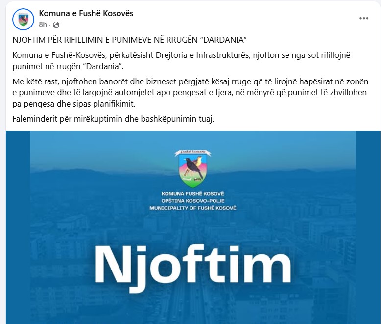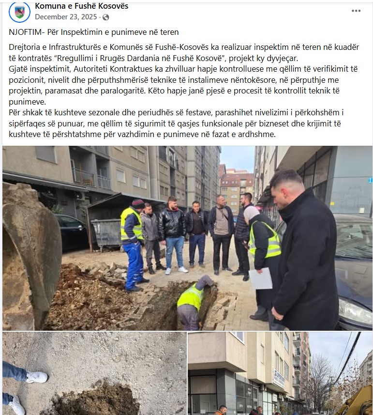 Në njoftimin e publikuar më 23 dhjetor, Komuna e Fushë Kosovës sqaronte se Drejtoria e Infrastrukturës kishte realizuar një inspektim në kuadër të kontratës “Rregullimi i Rrugës Dardania në Fushë Kosovë”, projekt ky i planifikuar si dyvjeçar. Sipas komunikatës, gjatë inspektimit janë kryer hapje kontrolluese për të verifikuar pozicionin, nivelin dhe përputhshmërinë teknike të instalimeve nëntokësore me projektin dhe paramasat, ndërsa ndalja e përkohshme e punimeve është arsyetuar me “kushtet sezonale” dhe periudhën e festave.
