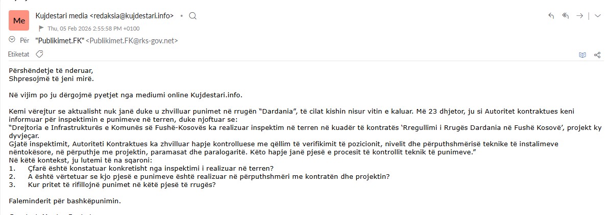 Kujdestari.info i ka drejtuar Komunës pyetje të qarta dhe të drejtpërdrejta: çfarë është konstatuar konkretisht nga inspektimi në terren? A është vërtetuar se punimet e deritanishme janë realizuar në përputhje me kontratën dhe projektin? Dhe, kur pritet të rifillojnë punimet në këtë pjesë të rrugës?