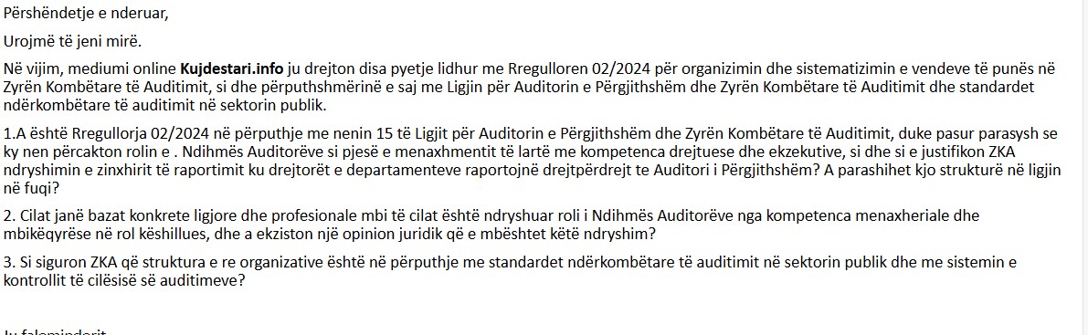 Deri në momentin e publikimit, Zyra Kombëtare e Auditimit nuk ka kthyer përgjigje në pyetjet e dërguara, para rreth dy javesh lidhur me bazën ligjore të këtij riorganizimi dhe arsyetimin juridik për ndryshimin e kompetencave të Ndihmës Auditorëve të Përgjithshëm. /Kujdestari.info/