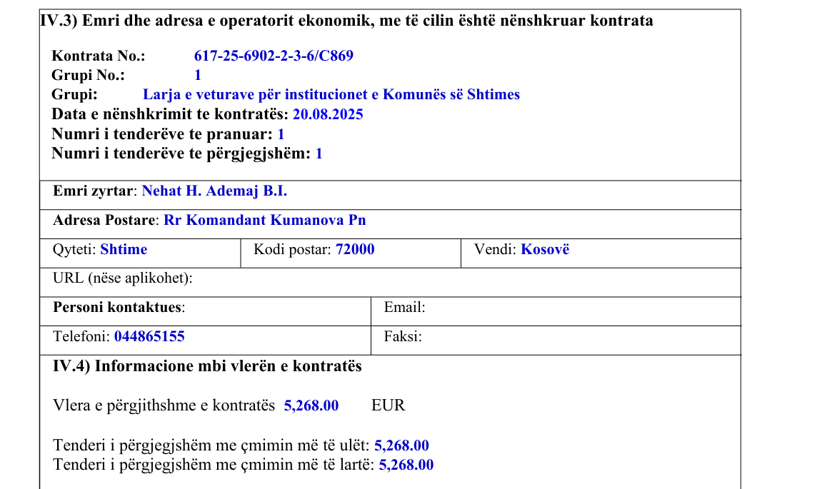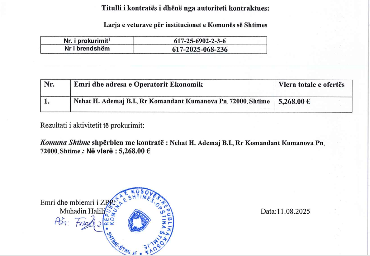 “Larja e veturave për institucionet e Komunës së Shtimes. Data e nënshkrimit te kontratës: 20.08.2025. Numri i tenderëve te pranuar: 1. Numri i tenderëve te përgjegjshëm: 1 Emri zyrtar: Nehat H. Ademaj B.I. Vlera e përgjithshme e kontratës 5,268.00 euro”, thuhet në njoftimin e shpallur.
