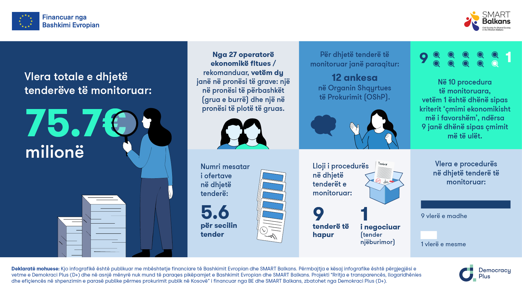 Sipas të dhënave, vlera totale e dhjetë tenderëve të monitoruar arrin në 75.7 milionë euro, ndërsa vetëm një tender është dhënë sipas kriterit të “çmimit ekonomikisht më të favorshëm”. Nëntë tenderë të tjerë janë shpërblyer vetëm në bazë të çmimit më të ulët, praktikë që ngre dyshime mbi cilësinë e shërbimeve dhe punimeve të kontraktuara.