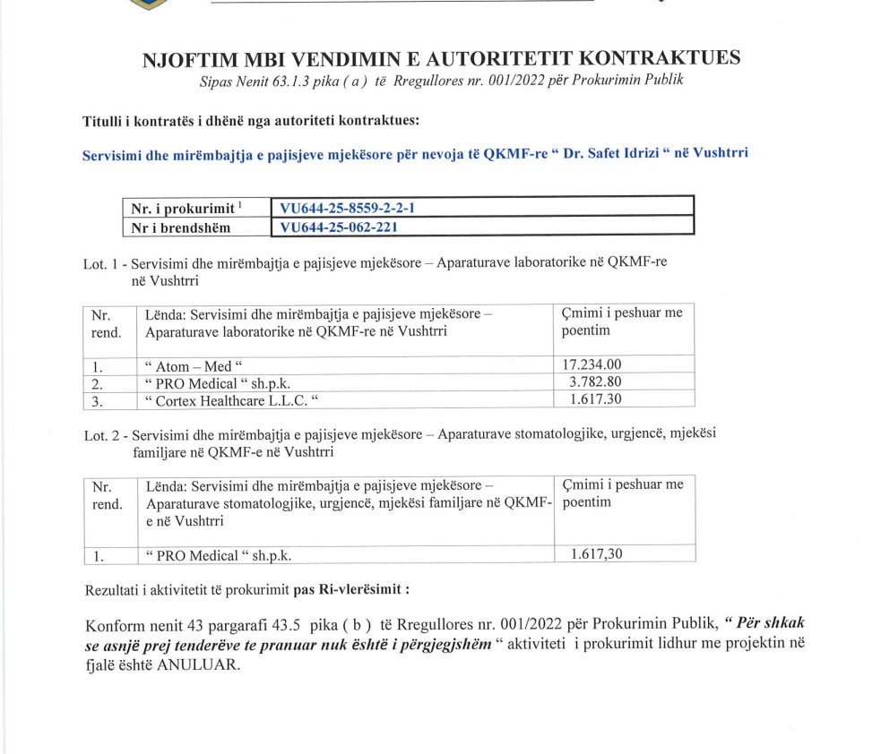 Komuna e Vushtrrisë e ka kthyer një procedurë të zakonshme prokurimi, me vlerë 108 mijë euro, në një proces të ndërlikuar që tashmë ka prodhuar dy vendime të Organit Shqyrtues të Prokurimit (OSHP) dhe një përplasje të re ligjore që sërish është në shqyrtim. Bëhet fjalë për tenderin për “Servisimin dhe mirëmbajtjen e pajisjeve mjekësore për nevojat e QKMF ‘Dr. Safet Idrizi’”, shkruan Kujdestari.info.