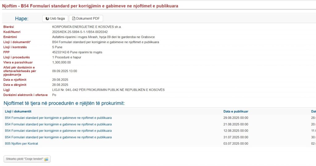 Korporata Energjetike e Kosovës (KEK), ka hapur tender për “Asfaltimi dhe riparimi i rrugës Mirash, hyrja 09 deri te garderoba në Grabovc”, me një vlerë të llogaritur prej 1.3 milionë eurosh.