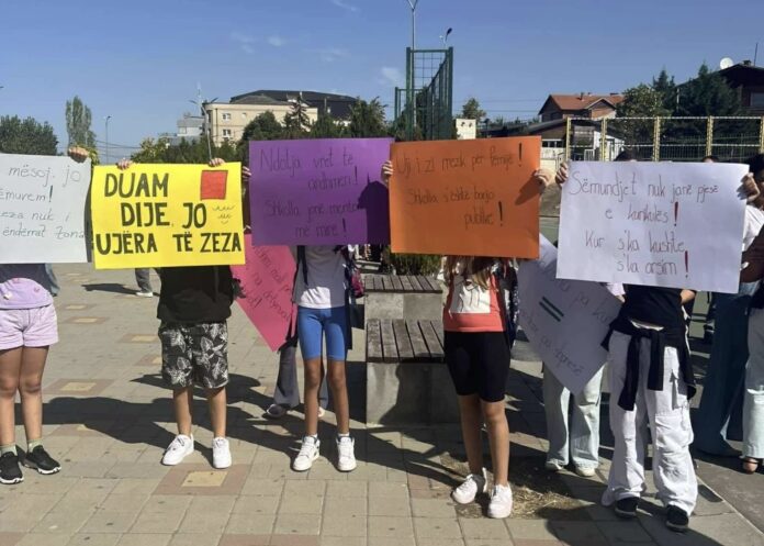 “Duam dije, jo ujëra të zeza”, shkruhej në njërën pankartë që mbanin nxënësit. “Shkolla s’është banjo publike”, shkruante një tjetër. E një fëmijë kishte shkruar: “Kishim mall për mësim, na detyruat për bojkot”.