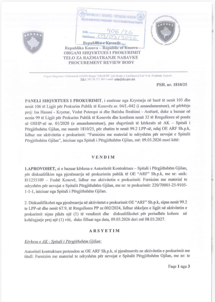 Vendimi është marrë më 9 mars 2026, pas shqyrtimit të kërkesës së Autoritetit Kontraktues – Spitalit të Përgjithshëm të Gjilanit, në kuadër të aktivitetit të prokurimit me titull “Furnizim me material të ndryshëm për nevojat e Spitalit të Përgjithshëm Gjilan”.