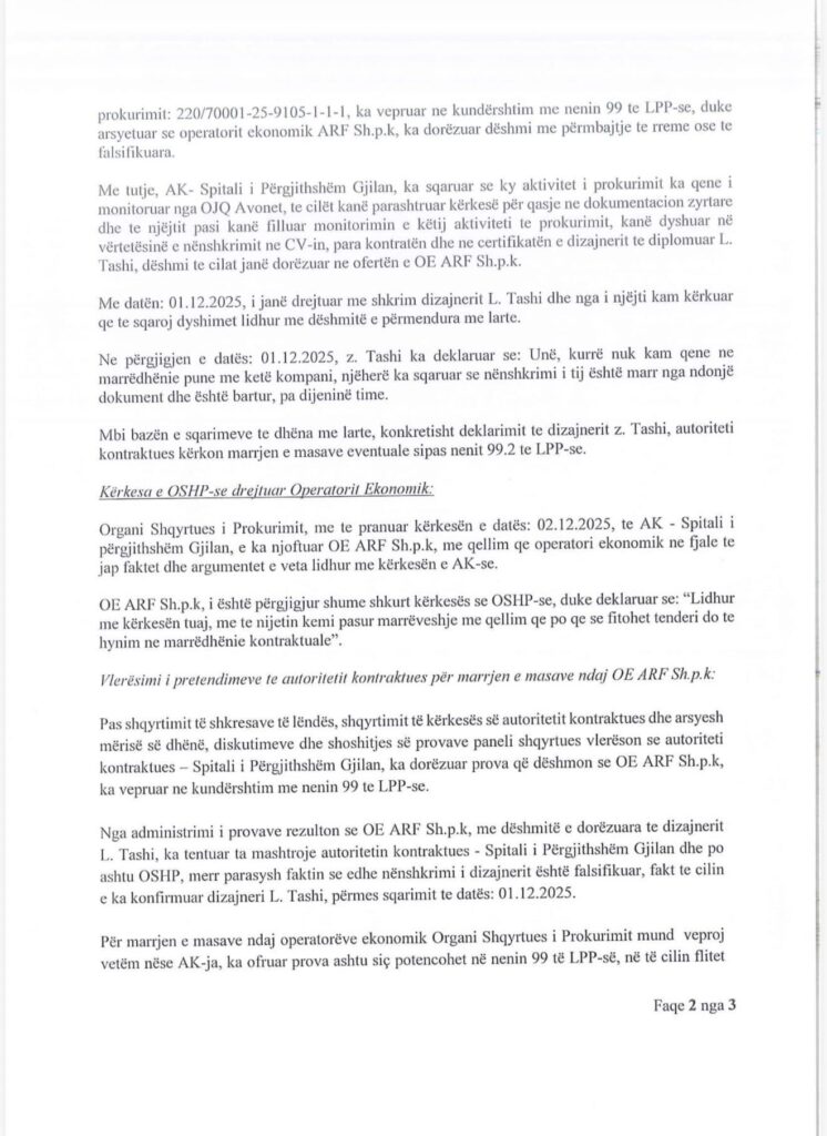 “Nga administrimi i provave rezulton se OE ARF Sh.p.k., me dëshmitë e dorëzuara të dizajnerit L. Tashi, ka tentuar ta mashtrojë autoritetin kontraktues – Spitalin e Përgjithshëm Gjilan dhe po ashtu OSHP-në”, thuhet në vendim.