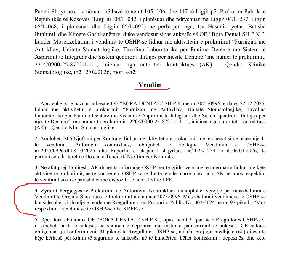 Në një vendim të detajuar dhe me implikime të drejtpërdrejta për mënyrën e menaxhimit të parasë publike në sektorin shëndetësor, Organi Shqyrtues i Prokurimit ka konstatuar shkelje serioze në një aktivitet të prokurimit të zhvilluar nga Qendra Klinike Stomatologjike, duke vlerësuar se procedurat nuk janë zhvilluar në përputhje me ligjin dhe se vendimet paraprake të këtij institucioni nuk janë zbatuar, çka ka çuar jo vetëm në anulimin e tenderit milionësh, por edhe në ndërmarrjen e masave disiplinore ndaj zyrtarit përgjegjës të prokurimit. (Vendim)