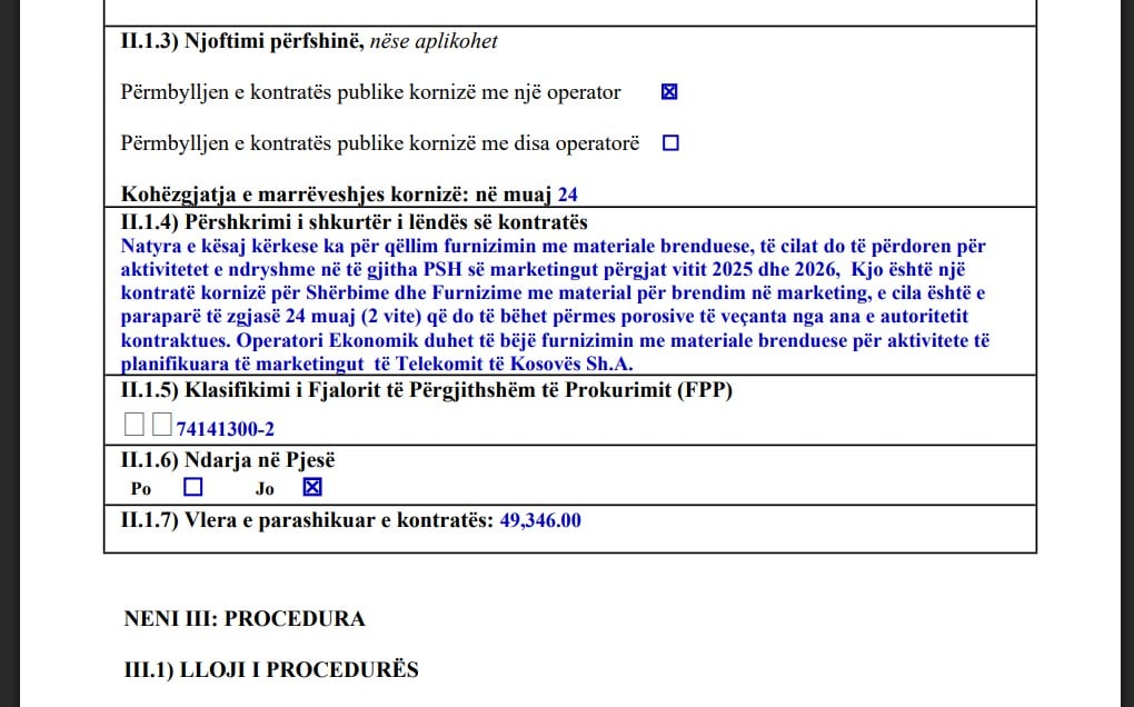 Bëhet fjalë për kontratën “Shërbime dhe furnizime me materiale për brendim në Marketing”, me vlerë të parashikuar rreth 50 mijë euro.