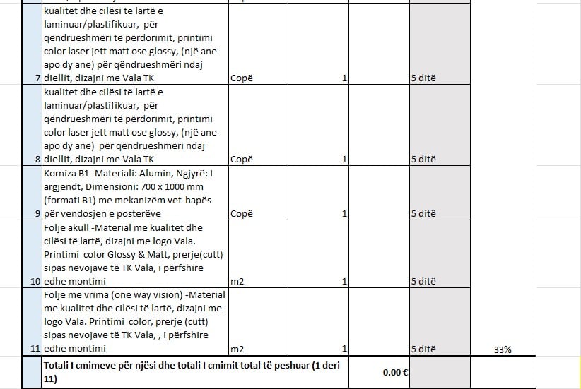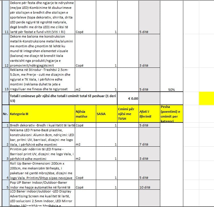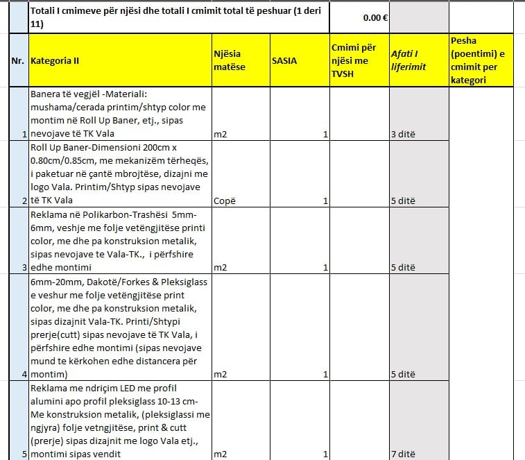 Sipas dosjes së tenderit, kompania duhet të furnizojë Telekomin me një gamë të gjerë materialesh, që nga postera dhe banera të vegjël, deri te reklama me ndriçim LED, bredha dekorativë, flamuj me bazament, e madje edhe dekorime me balona për evente.