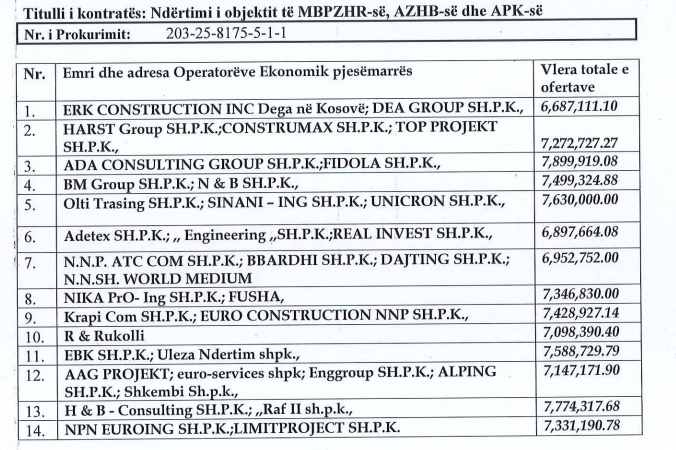 14 oferta ka pranuar për këtë tender, i cili ishte hapur ne qeverisjen e Faton Pecit, konkretisht më datë 3 tetor 2025.