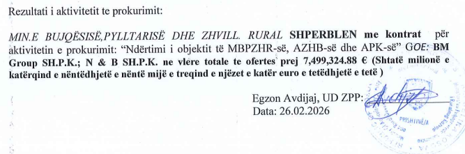 Ministria e Bujqësisë, Pylltarisë dhe Zhvillimit Rural (MBPZHR) ka publikuar rezultatin e vlerësimit për njërin nga tenderët më të mëdhenj “Ndërtimi i objektit të MBPZHR-së” dhe ka rekomanduar për kontratë grupin e operatorëve ekonomikë “MB Group SH.P.K.” & “N & B SH.P.K.” me ofertë në vlerë 7,499,324.88 euro, shkruan Kujdestari.info.