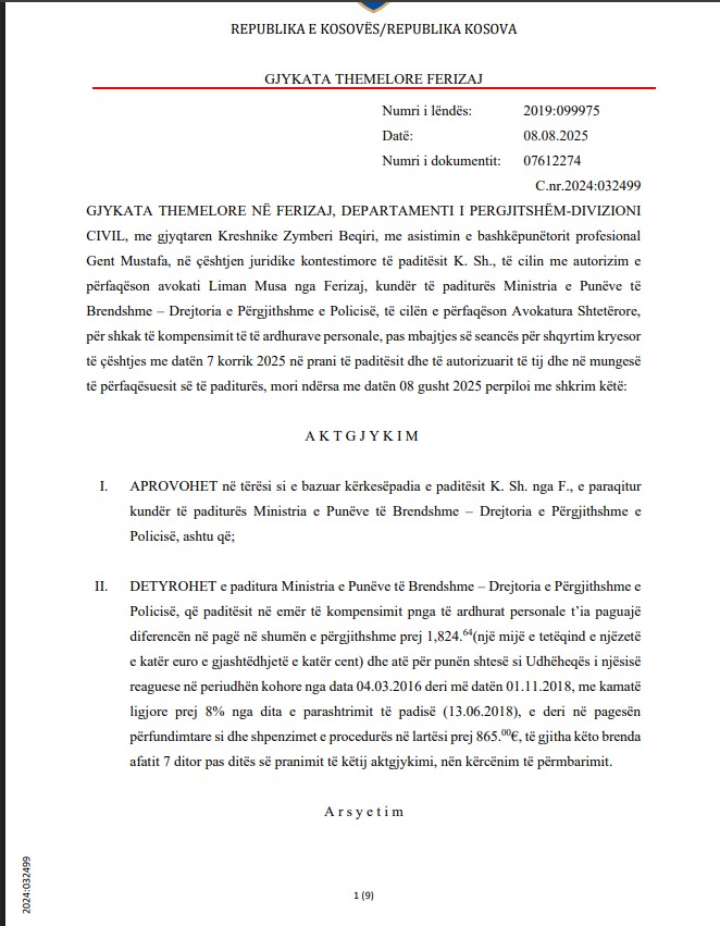 Pas gjithë këtij kalvari, gjykatësja Kreshnike Zymberi Beqiri, me asistimin e bashkëpunëtorit profesional Gent Mustafa, vendosi ta aprovojë padinë në tërësi, duke detyruar MPB-në që t’ia paguajë diferencën prej 1,824.64 euro, me kamatë ligjore prej 8% nga dita e paraqitjes së padisë, si dhe 865 euro për shpenzimet e procedurës gjyqësore.