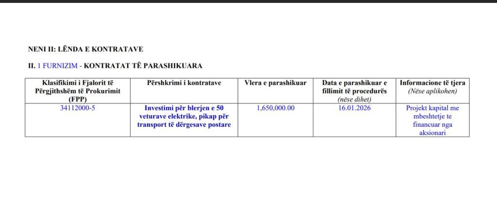 Në dokument theksohet se bëhet fjalë për projekt kapital, i cili do të realizohet me mbështetje financiare nga aksionari, ndërsa veturat elektrike janë paraparë të përdoren si mjete transporti për dërgesat postare, në kuadër të modernizimit të flotës së Postës së Kosovës.