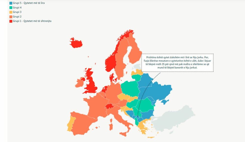 Prishtina renditet si kryeqyteti më i lirë në Evropë sa i përket kostos së jetesës, qirave, çmimeve të ushqimeve dhe në restorante. Megjithatë, edhe fuqia blerëse është ndër më të ulëtat, duke lënë prapa vetëm Athinën, Shkupin, Beogradin, Lisbonën, Kievin, Kishinjevin dhe Tiranën.
