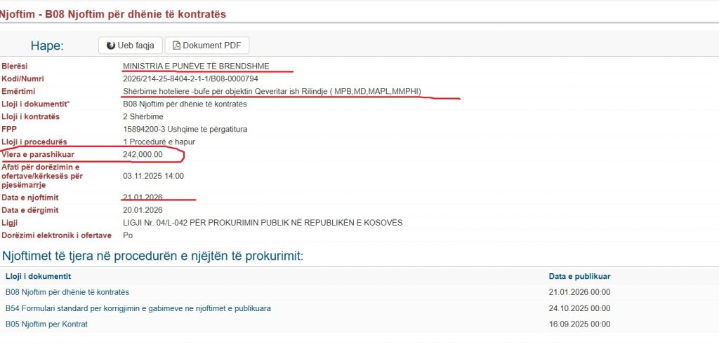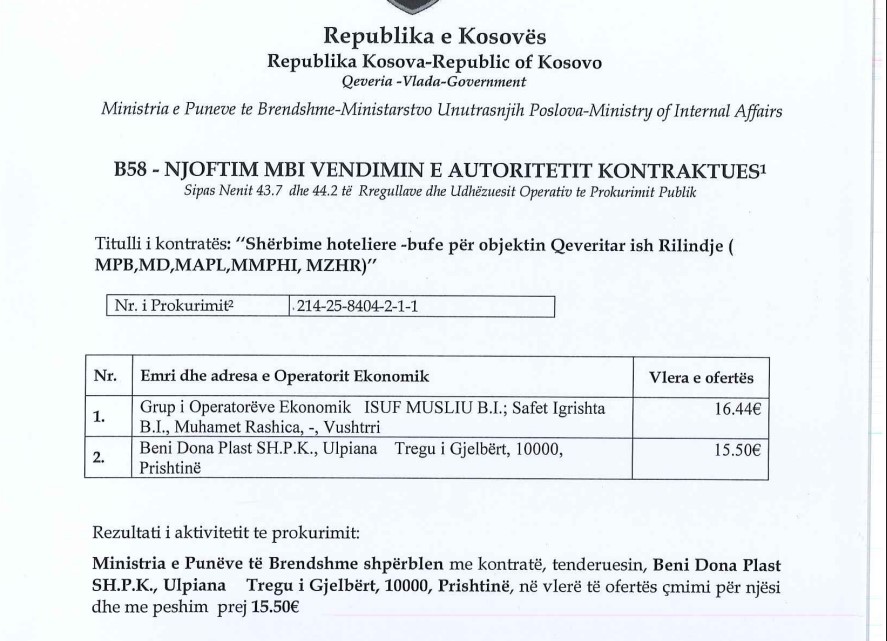 Tenderi ishte iniciuar në shtator të vitit të kaluar, por kishte hasur në ankesa. “Shërbime hoteliere – bufe për objektin qeveritar ish Rilindje (MPB, MD, MAPL, MMPHI)”, quhet tenderi që pritet të shndërrohet në kontratë pas dy ditësh ndërmjet Ministrisë së Punëve të Brendshme dhe kompanisë “Beni Dona Plast” SH.P.K.