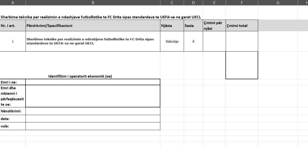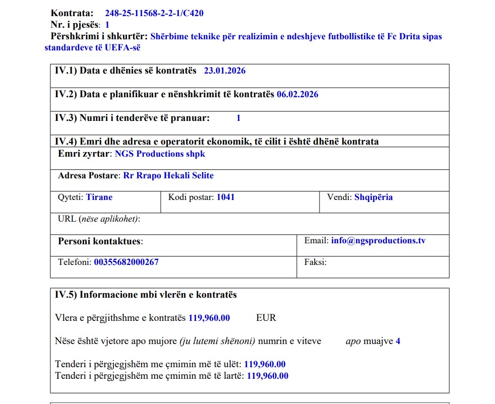 Sipas dokumentacionit zyrtar të tenderit, kontrata për “Shërbime teknike për realizimin e ndeshjeve futbollistike të FC Drita sipas standardeve të UEFA-së” është paraparë të nënshkruhet më 6 shkurt 2026, ndërsa vlera totale e saj arrin në 119,960 euro. Procedura është zhvilluar me vetëm një ofertues të pranuar, çmimi i të cilit përkon saktësisht me vlerën përfundimtare të kontratës.