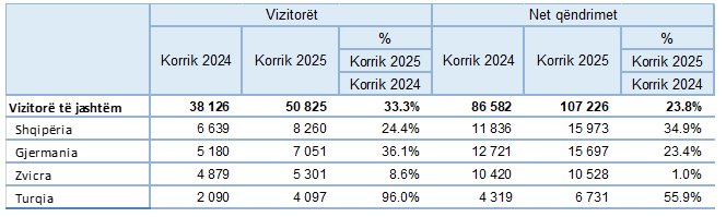 Në anën tjetër, numri i vizitorëve të huaj në hotelet e Kosovës arriti në 50 825, duke regjistruar një rritje prej 33,3% krahasuar me korrikun e vitit 2024.
