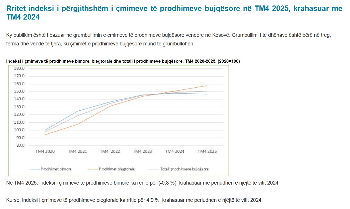 Agjencia e Statistikave të Kosovës (ASK) ka publikuar Indeksin e Çmimeve të Prodhimeve dhe Çmimet në Bujqësi për tremujorin e katërt (TM4) të vitit 2025, duke raportuar një rritje prej 1.2 për qind të indeksit të përgjithshëm krahasuar me të njëjtën periudhë të vitit 2024, shkruan Kujdestari.info.