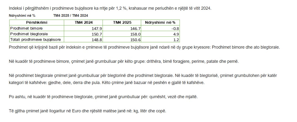 Në fund, edhe pse ASK ofron shifra krahasuese dhe indekse standarde, raporti mbetet më shumë një pasqyrë numerike sesa një analizë që ndihmon politikëbërjen, fermerët apo publikun të kuptojnë se çfarë po ndodh realisht me çmimet dhe prodhimin bujqësor në vend. /Kujdestari.info/