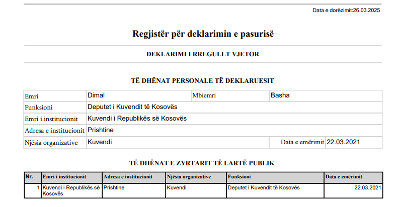 Basha në APK ka deklaruar 1,500 euro para të gatshme në një llogari, derisa edhe 500 dollar tjera në një llogari tjetër.