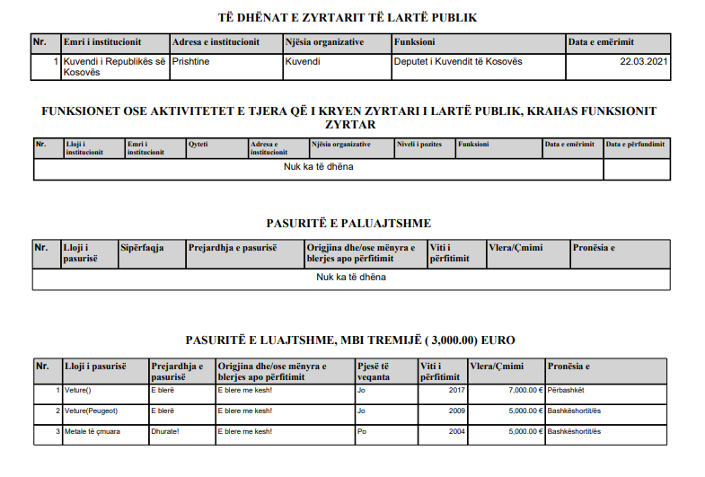 Kurse, të hyra ka deklaruar pagë vjetore prej 23 mijë e 68 euro nga Kuvendi i Kosovës.