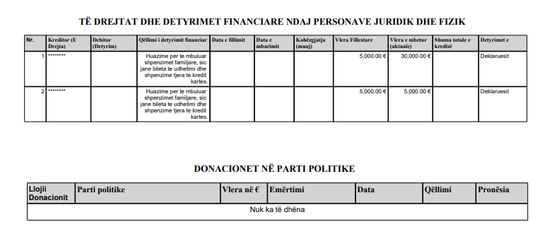 Ndërsa, ka deklaruar edhe metale të çmuara dhuratë e blerë me kesh në vitin 2004, në vlerë prej 5 mijë euro.