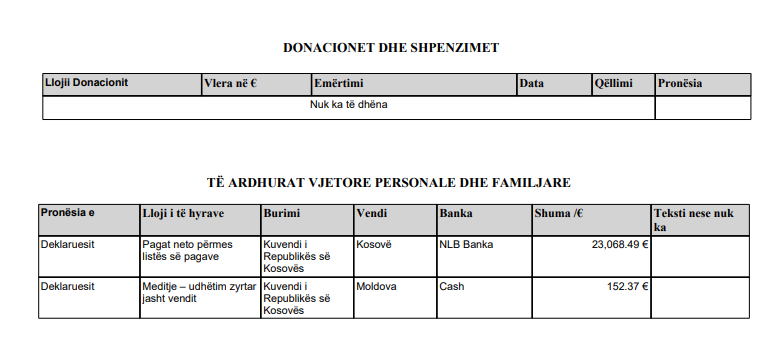 Ndërsa, për vitin 2025 ka deklaruar edhe mëditje që ka marrë për vizitat jashtë vendit, si në Moldavi ku i ka marrë 152 euro