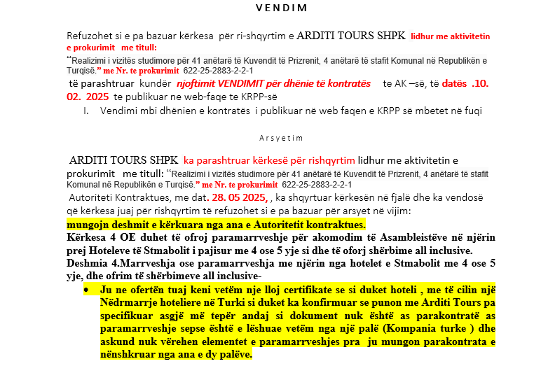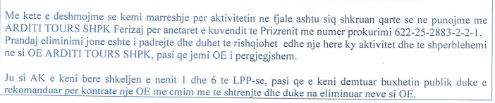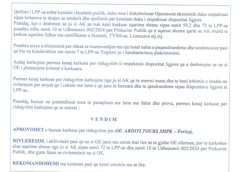 Operatori Ekonomik, Arditi Tours kishte bëbë ankesë ndaj vendimit të Autoritetit Kontraktues që ta eliminoj këtë Operator edhe pse e kishte çmimin më të ulët dhe ishte operator i përgjegjshëm.