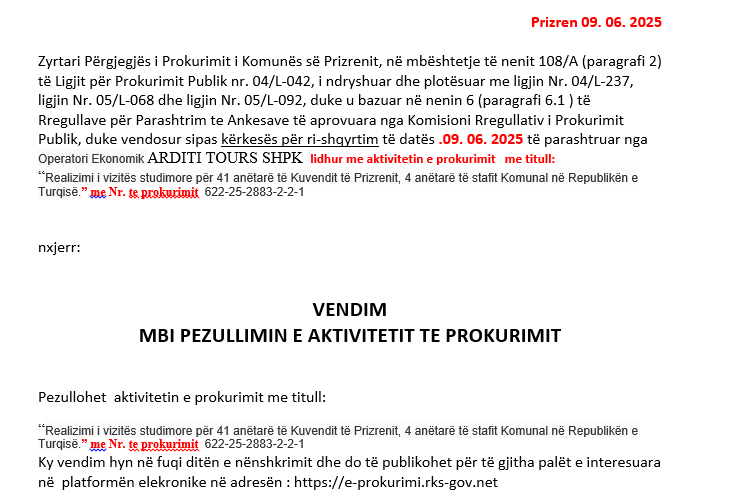 Pas refuzimit të ankesës së Ariti Tours dhe pranimit pjesërisht të ankesës së Halimaj Reisen, me 6 qershor 2025, Autoritetit Kontraktues kishte marrë vendim për pezullimin e shpalljes së tenderit.