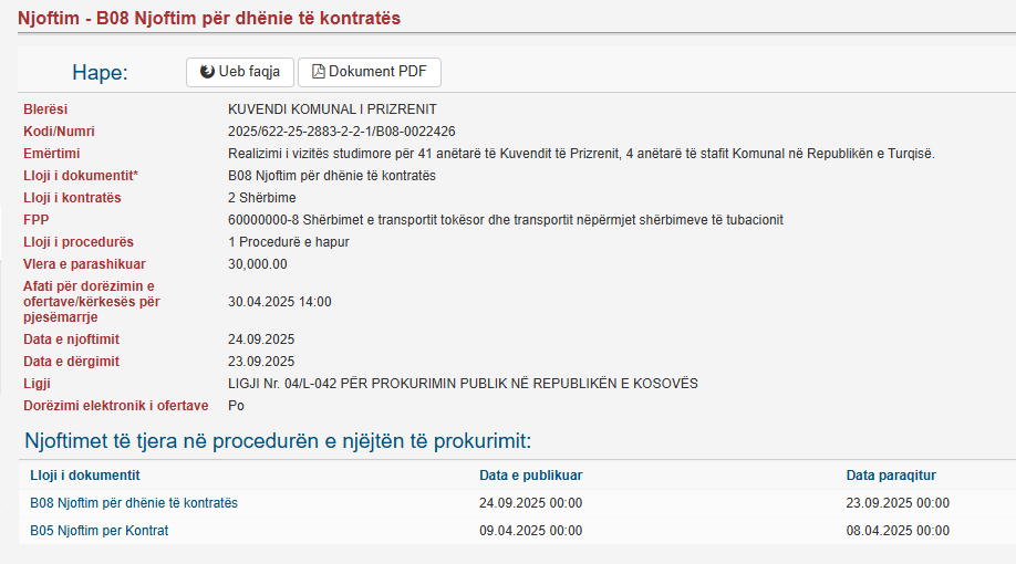 Për këtë tenderë ishin paraparë 30 mijë euro, derisa, fitues është shpall operatori Arditi Tours me çmimin me të ulët prej 19 mijë e 260 euro.