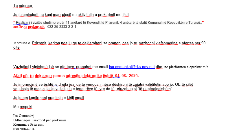 Pas gjithë kësaj sage të këtij tenderi, Autoriteti Kontraktues, në këtë rast, Kuvendi Komunal i Prizrenit u kishte kërkuar Operatorëve Ekonomik që të deklarohen nëse duan ta zgjasin vlefshmprinë e ofertës edhe për 90 ditë.