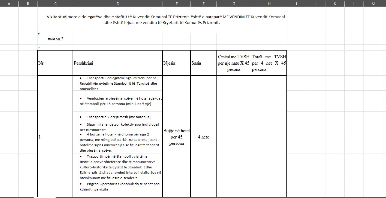Në dokumentin e tenderit, i cili i referohet si “program i vizitës studimore”, parashihen transporti me autobus, akomodimi në hotel me 4 ose 5 yje për katër net, ushqimet dhe vizitat nëpër monumente kulturo-historike të Stambollit dhe Edirnesë. Megjithatë, nga përmbajtja e paramasës është e qartë se nuk bëhet fjalë për kurrfarë vizite studimore në kuptimin akademik ose profesional, por për një ekskursion turistik, të kamufluar me termin “vizitë studimore”.
