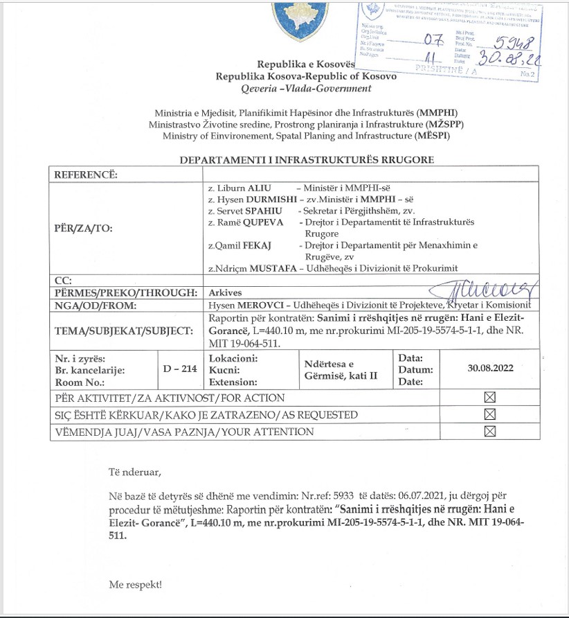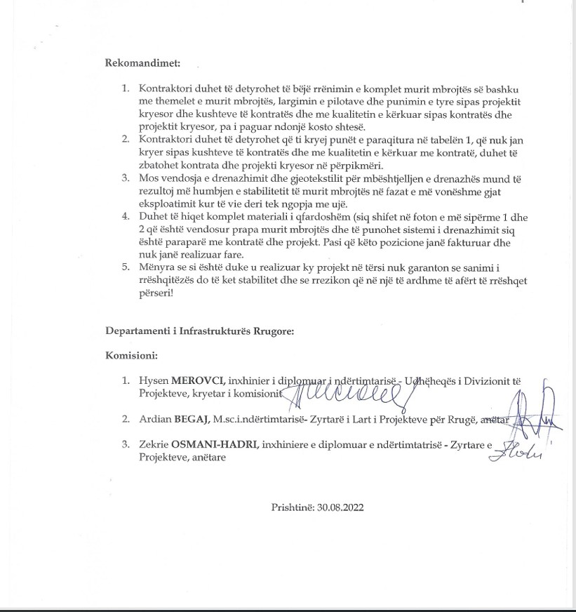 Në gusht të vitit 2022, një komision i brendshëm i Ministrisë së Infrastrukturës – i përbërë nga Hysen Merovci, Ardian Begaj dhe Zekrie Osmani-Hadri – vizitoi vendin e punimeve dhe përpiloi një raport prej 11 faqesh. Raporti, i dërguar te ish-ministri Liburn Aliu, zv/ministri Hysen Durmishi, ish-sekretari Servet Spahiu dhe autoritete të tjera, përmban gjetje alarmante.