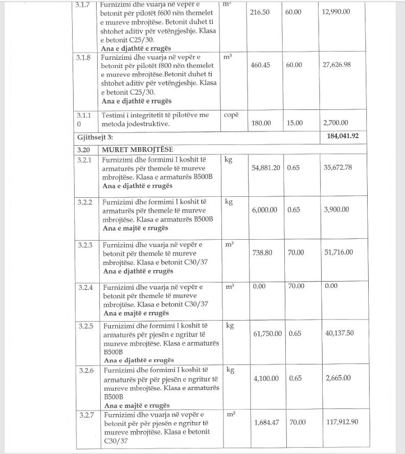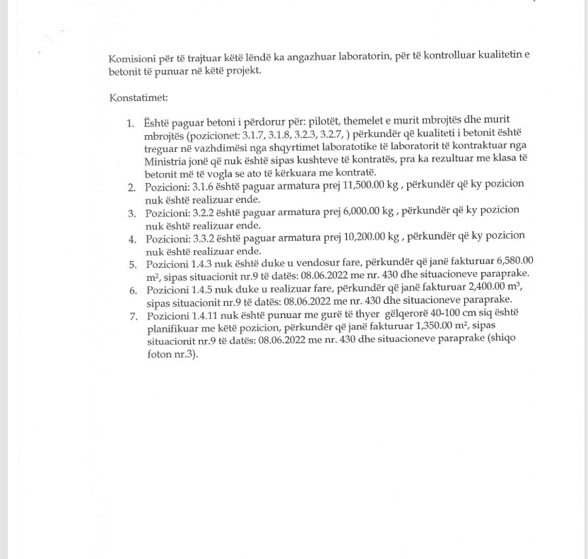 - Është paguar beton për themelet, pilotët dhe murin mbrojtës, por cilësia e betonit ka dalë më e dobët se standardet e kontraktuara, sipas laboratorit të Ministrisë.