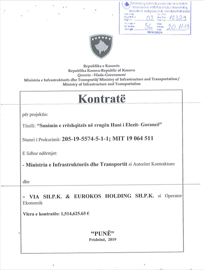 Më 20 nëntor 2019, Ministria e Infrastrukturës lidhi kontratën me kompanitë “Via Shpk” dhe “Eurokos Holding Shpk”, në vlerë prej 1,514,625.65 euro. Afati i punimeve ishte 140 ditë pune. Në emër të autoritetit kontraktues kontratën e nënshkroi ish-ministri Pal Lekaj, ish-zyrtari kryesor administrativ Betim Reqica dhe ish-shefja e prokurimit Valmira Bllaca. Ndërsa në anën tjetër, për kompaninë, nënshkroi drejtori i “Via Shpk”, Driton Shamolli.