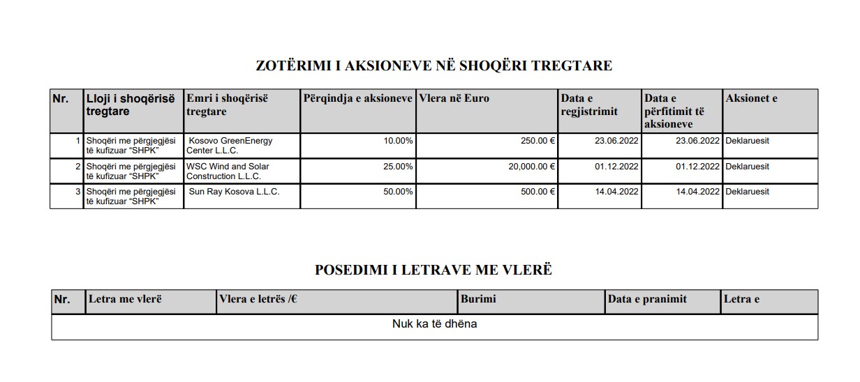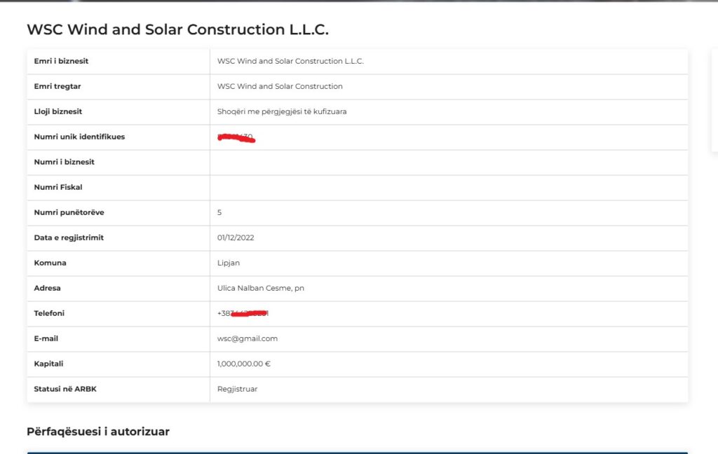 Në kompaninë WSC Wind and Solar Construction L.L.C., sipas të dhënave të ARBK-së, Driton Hyseni figuron si përfaqësues i autorizuar, ndërsa Florin Imeri si drejtor menaxhues.