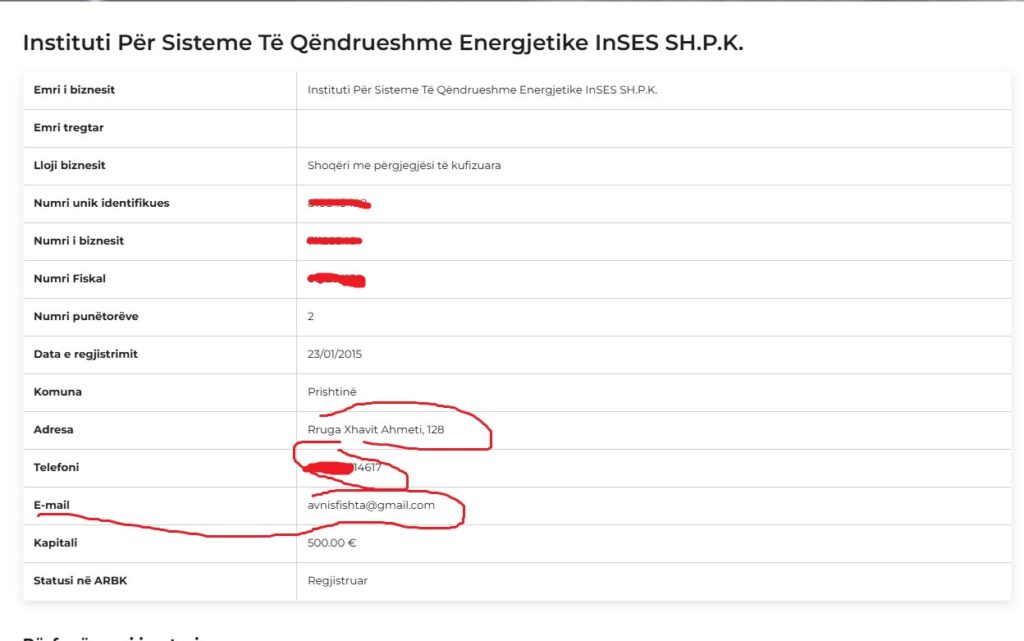 Sipas dokumenteve qe posedon Kujdestari.info, te kompania kontraktuese InSES SH.P.K., adresa figuron si “Rruga Xhavit Ahmeti, 128” në Prishtinë. Po në këtë adresë figuron edhe kompania Kosovo GreenEnergy Center L.L.C., ku ortakë rezultojnë të jenë Avni Sfishta dhe Driton Hyseni. Po ashtu, sipas materialit të dorëzuar, edhe numri i telefonit figuron i njëjtë ndërmjet InSES dhe kësaj kompanie tjetër. Në InSES po ashtu figuron edhe email adresa [email protected].
