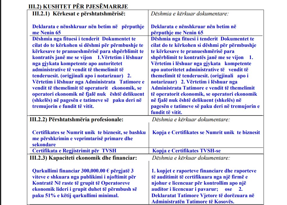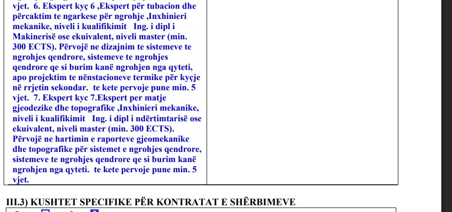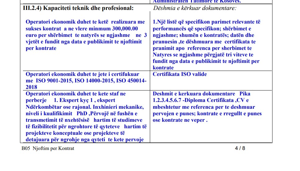 Nga ana tjetër, sipas asaj që pretendon hulumtimi, përveç afatit të shkurtuar, dosja e tenderit ka përmbajtur edhe kritere të shumta, të cilat vështirë se do të mund të plotësoheshin shpejt nga kompani që nuk do të kishin parapërgatitje ose njohuri të hershme për aktivitetin. Pikërisht kombinimi i këtyre dy elementeve, pra afat i shkurtuar dhe kritere të shumta e të specializuara, e zhvendos çështjen nga një procedurë e zakonshme drejt një tenderi që meriton shqyrtim shumë më rigoroz.