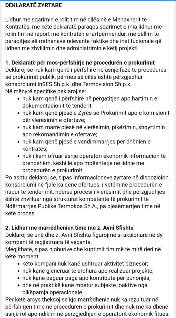 Në pjesën e parë të deklaratës së tij, Hyseni thotë: “Deklaroj se nuk kam qenë i përfshirë në asnjë fazë të procedurës së prokurimit publik, përmes së cilës është përzgjedhur konsorciumi InSES Sh.p.k. dhe Termovision Sh.p.k.”