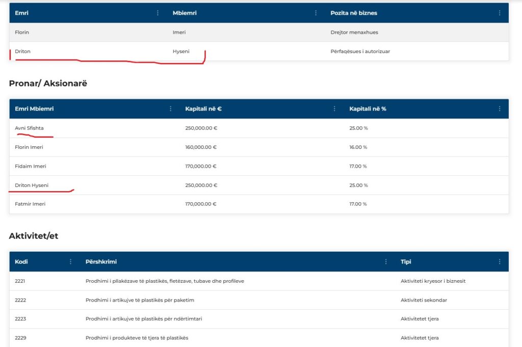 Në dy prej tyre, Avni Sfishta figuron si bashkaksionar me Driton Hysenin.