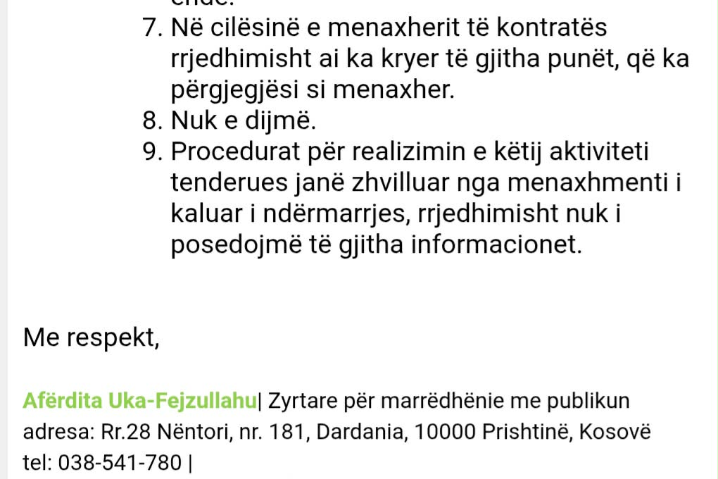 “Procedurat për realizimin e këtij aktiviteti tenderues janë zhvilluar nga menaxhmenti i kaluar i ndërmarrjes, rrjedhimisht nuk i posedojmë të gjitha informacionet.”