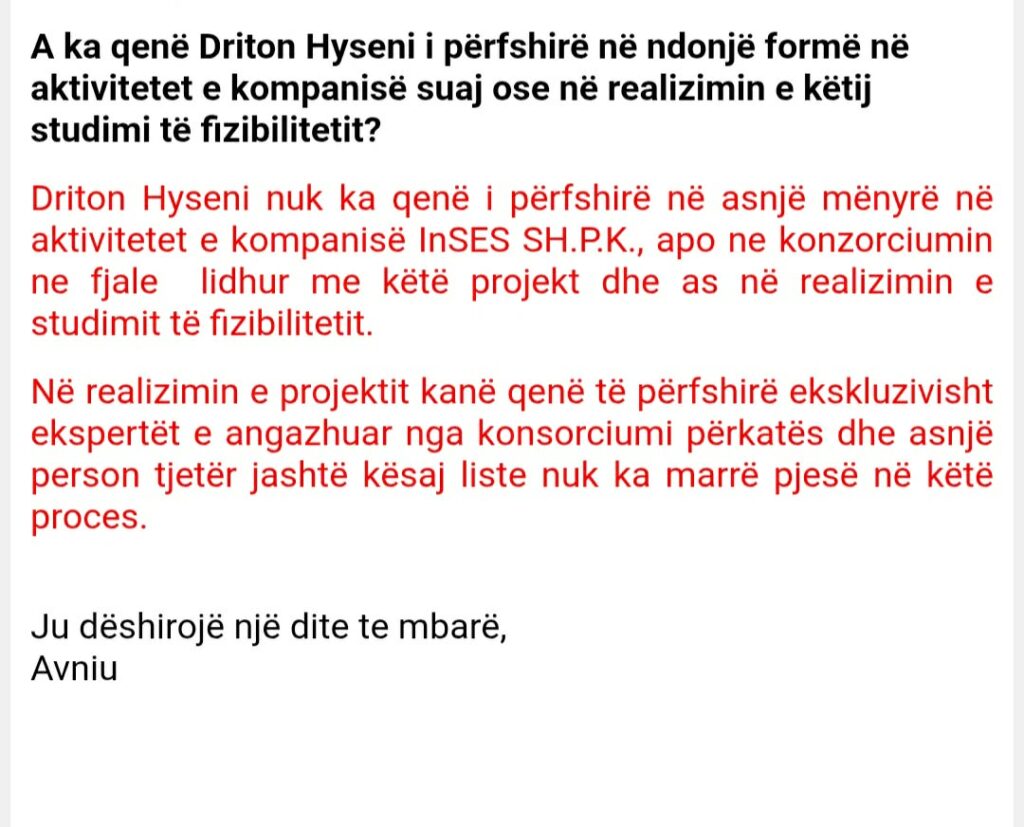 Në përgjigjet e tij për Kujdestari.info, Avni Sfishta ka mohuar çdo përfshirje të Driton Hysenit në projektin përkatës dhe çdo lidhje relevante të tij me kompaninë fituese në kuadër të këtij aktiviteti. Ai fillimisht ka sqaruar se kompania InSES SH.P.K., të cilës i referohet kontrata e Termokos-it, nuk është dhe nuk ka qenë asnjëherë në pronësinë e tij, duke theksuar se kjo mund të verifikohet lehtësisht përmes të dhënave zyrtare në Agjencinë për Regjistrimin e Bizneseve të Kosovës (ARBK). Sa i përket rolit të Driton Hysenit, Sfishta ka deklaruar se ai nuk ka pasur asnjë funksion, rol apo angazhim në këtë projekt dhe nuk ka qenë i përfshirë në asnjë formë bashkëpunimi me kompaninë InSES SH.P.K. apo me konsorciumin në fjalë gjatë realizimit të studimit.
