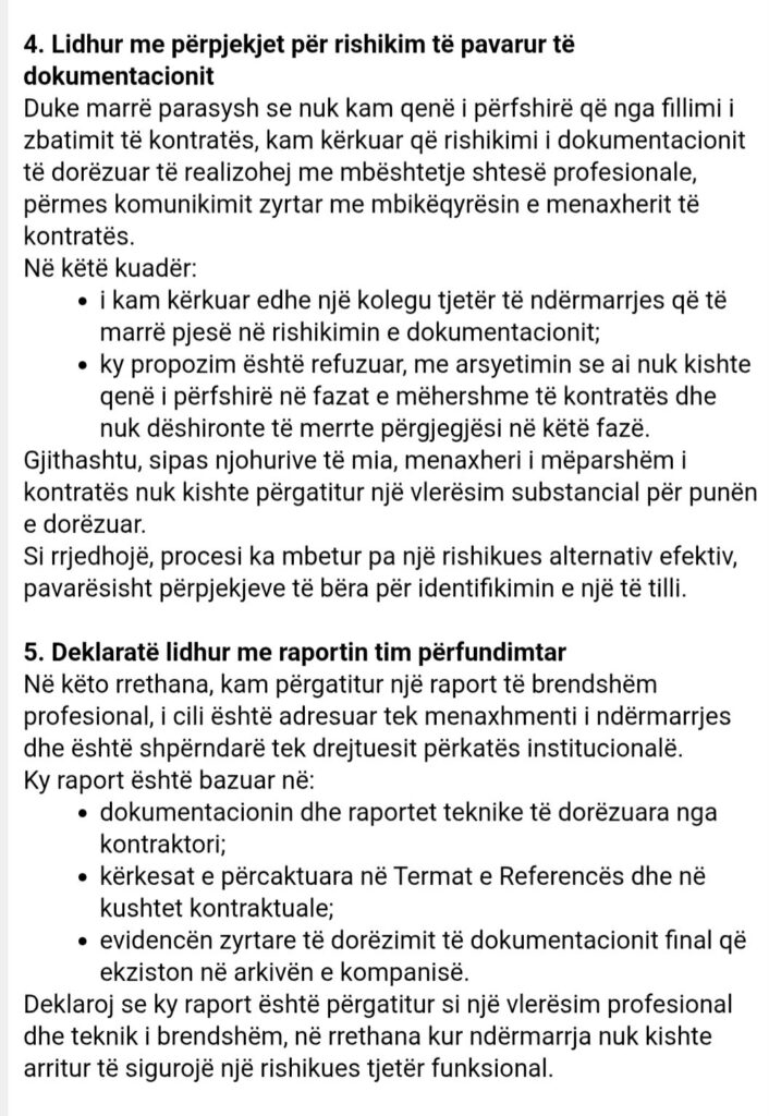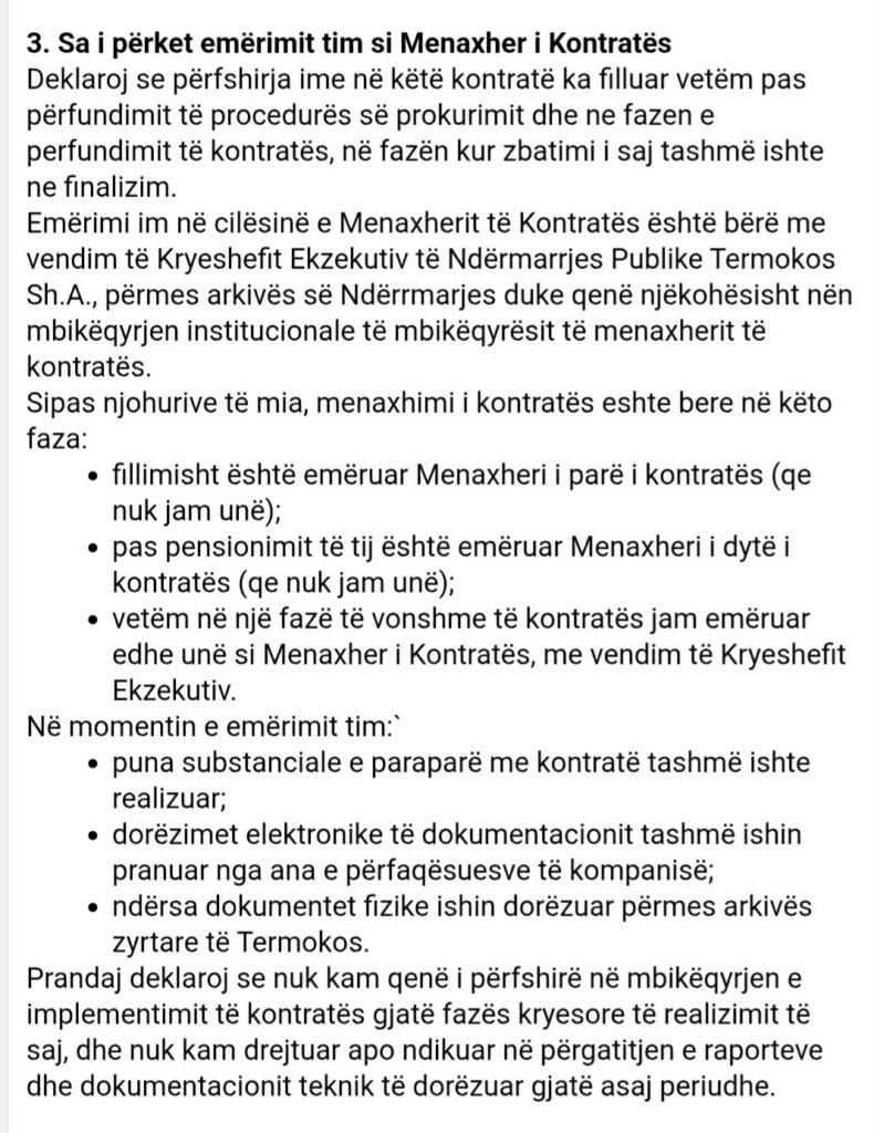 Ai thotë gjithashtu se: “fillimisht është emëruar Menaxheri i parë i kontratës (qe nuk jam unë); pas pensionimit të tij është emëruar Menaxheri i dytë i kontratës (qe nuk jam unë);