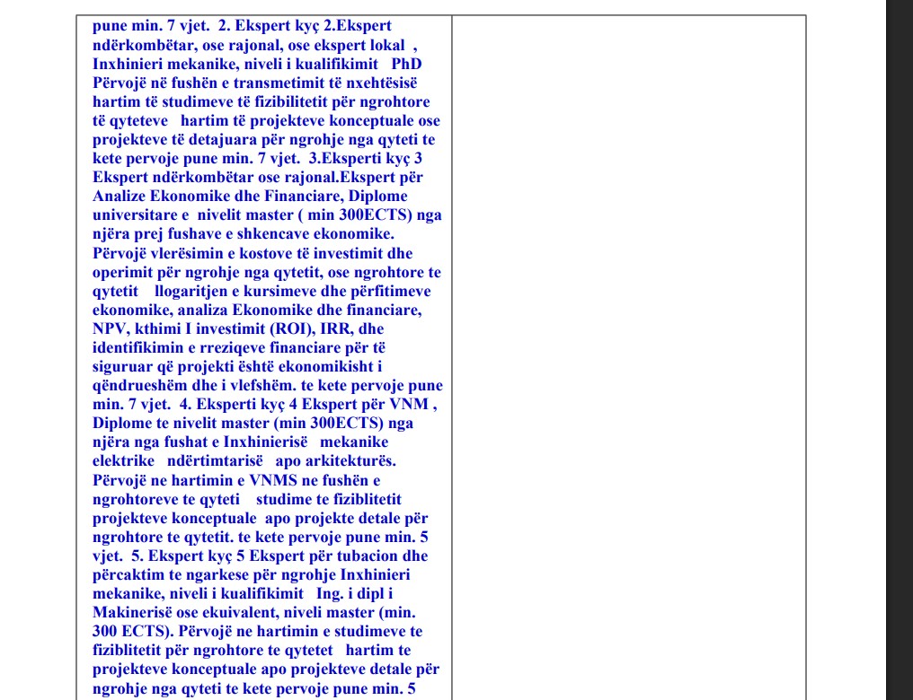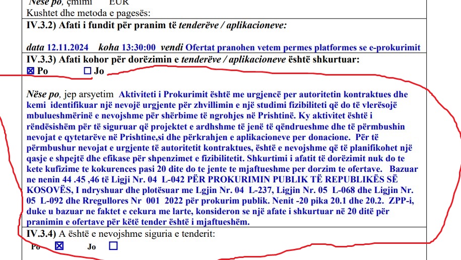 “Aktiviteti i Prokurimit është me urgjencë per autoritetin kontraktues dhe kemi identifikuar një nevojë urgjente për zhvillimin e një studimi fizibiliteti që do të vlerësojë mbulueshmërinë e nevojshme për shërbime të ngrohjes në Prishtinë. Ky aktivitet është i rëndësishëm për të siguruar që projektet e ardhshme të jenë të qëndrueshme dhe të përmbushin nevojat e qytetarëve në Prishtine, si dhe përkrahjen e aplikacioneve per donacione. Për të përmbushur nevojat e urgjente të autoritetit kontraktues, është e nevojshme që të planifikohet një qasje e shpejtë dhe efikase për shpenzimet e fizibilitetit. Shkurtimi i afatit të dorëzimit nuk do te kete kufizime te kokurences pasi 20 dite do te jente te mjaftueshme per dorzim te ofertave”.
