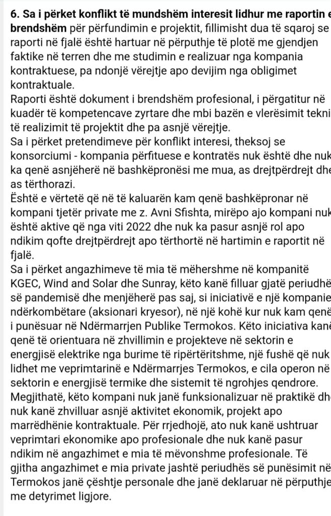 Ai pranon një marrëdhënie të mëhershme biznesore me Avni Sfishtën, por përpiqet ta shkëpusë atë nga kontrata konkrete: “Është e vërtetë që në të kaluarën kam qenë bashkëpronar në kompani tjetër private me z. Avni Sfishta, mirëpo ajo kompani nuk është aktive që nga viti 2022 dhe nuk ka pasur asnjë rol apo ndikim qofte drejtpërdrejt apo tërthortë në hartimin e raportit në fjalë.”
