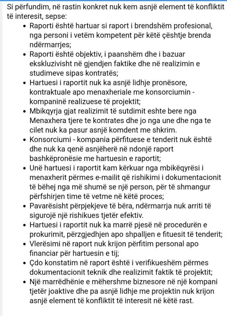 Ai thekson edhe se në këtë rast nuk ekziston konflikt interesi, pasi nuk ka asnjë interes privat aktual apo lidhje pronësore që do të mund të ndikonte në vlerësimin profesional të projektit.