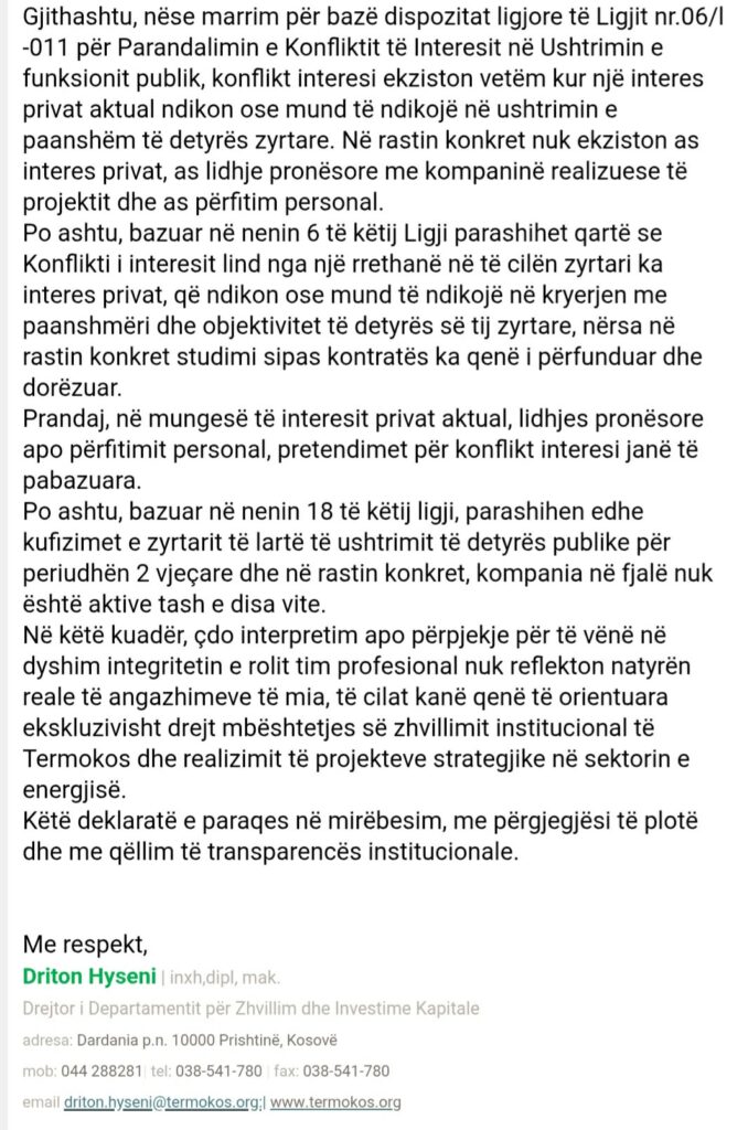 “Driton Hyseni ka qenë anëtar i Bordit të Drejtorëve të ndërmarrjes nga viti 2019 deri në vitin 2021, prej të cilit post ka dhënë dorëheqje pak kohë para skadimit të mandatit. Nga 25.04.2023 është angazhuar si ekspert i jashtëm për njësinë e implementimit të projekteve në një periudhë 1 vjeçare. Prej 08.03.2024 ka qenë në pozitën e zëvendësdrejtorit të Departamentit të distribuimit. Ndërkaq, prej 17.03.2025 është përzgjedhur drejtor i Departamentit për zhvillim dhe investime kapitale, në të cilën pozitë është ende.”